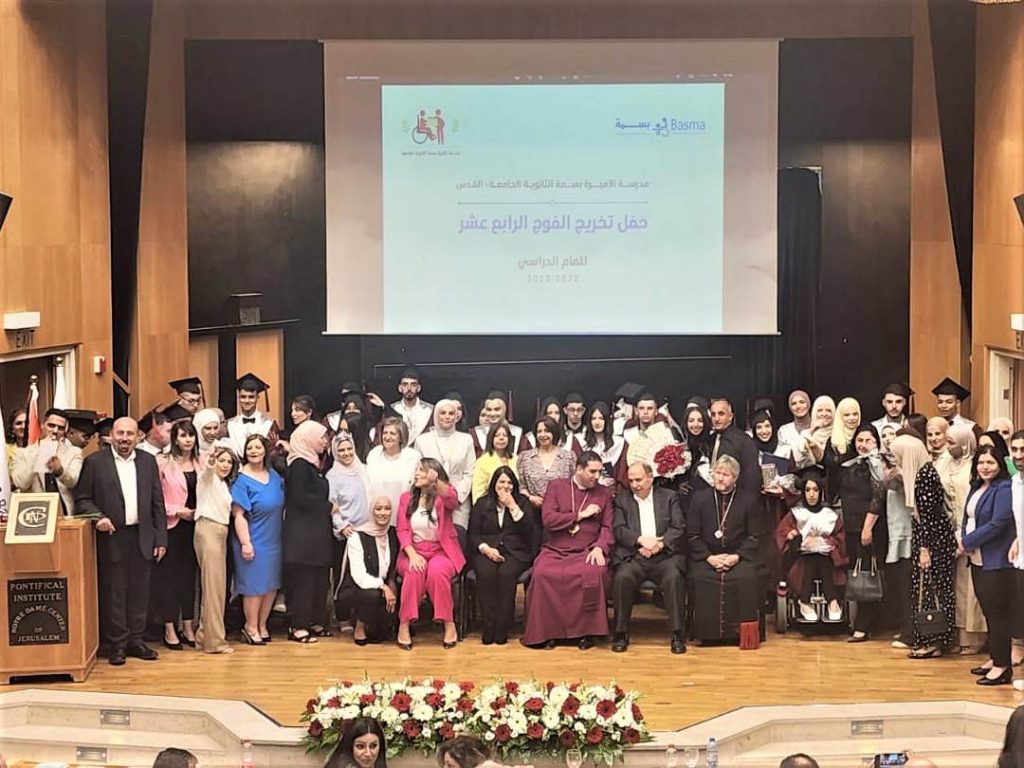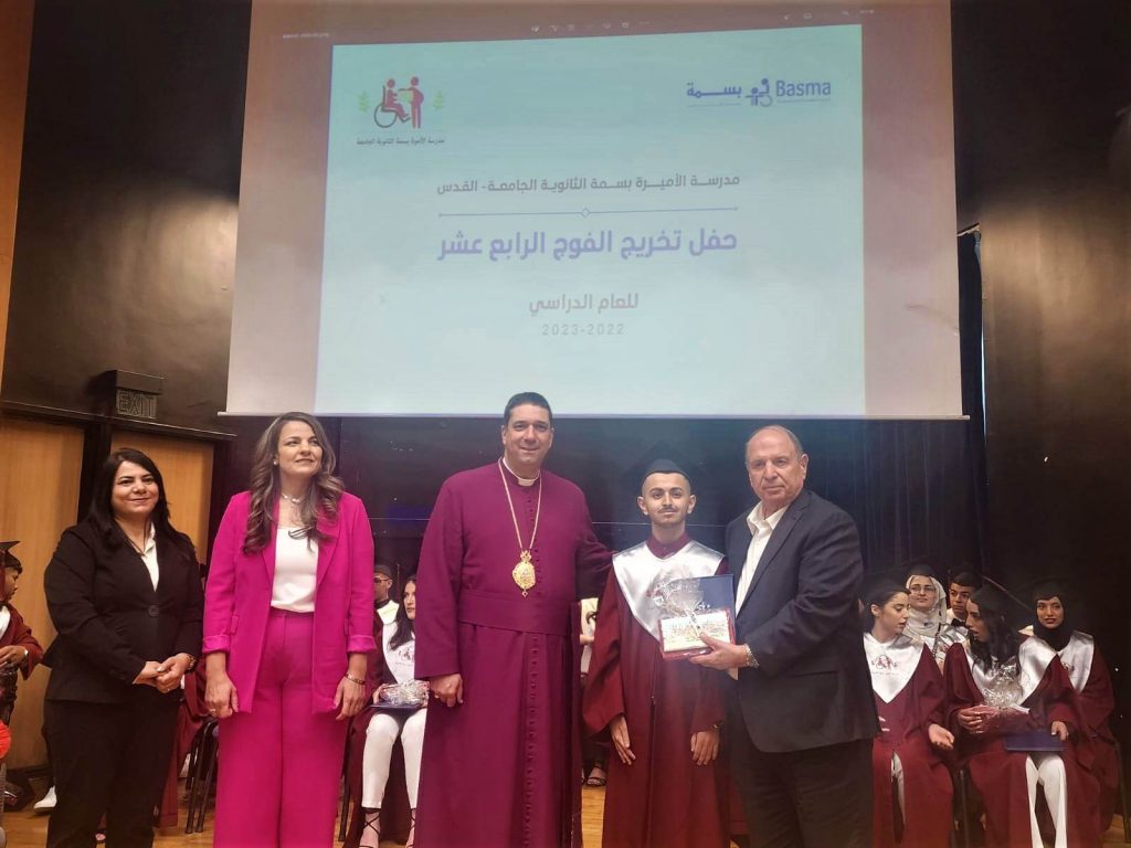 العاصمة المحتلة / احتفلت مدرسة الأميرة بسمة الثانوية الدامجة مساء الاربعاء في مسرح فندق النوتردام بالقدس ، بتخريج وتكريم الفوج الرابع عشر من طلبة الثانوية العامة “التوجيهي” للعام الدراسي 2023 ، بحضور مهيب من أولياء أمور الطلبة ، وأعضاء الهيئتين التدريسية والإدارية لمؤسسة ومدرسة الأميرة بسمة، بمشاركة ثلة من الشخصيات الدينية والإعتبارية والوطنية المقدسية ، على رأسهم عضو اللجنة التنفيذية لمنظمة التحرير الفلسطينية ، رئيس دائر شؤون القدس ، المهندس عدنان الحسيني، وغبطة رئيس أساقفة القدس والشرق الأوسط المطران حسام نعوم . واستهلّ الحفل بدخول موكب الخريجات والخريجين ، تلا ذلك الوقوف دقيقة صمت إجلالاً وإكباراً للشهداء ، وتحية صمود وعِزة للأسرى ، تبعها إلقاء التحية الوطنية إبان الاستماع الى السلام الوطني الفلسطيني . وفي كلمته استعرض المطران نعوم ، بعض من إنجازات مدرسة الأميرة بسمة الثانوية الدامجة، معبرا عن فخره بوجود مدرسة تؤمن بضرورة وجود إطار تعليمي جامع يضم كافة شرائح الطلبة مع بعضهم البعض في بوتقة واحدة ، ودمج الطلبة ذوي الإعاقة مع غيرهم لبناء مجتمع متكافئ يقوم على المساواة وتقبل الاختلاف. وأعرب نيافته عن فخره باستراتيجية عمل مؤسسة الأميرة بسمة في معالجة اضطراب التوحد ، كما اشاد بدور الأهل على ثقتهم التي أولوها للمدرسة وطاقمها المتميز واستثمارهم في بناتهم وأولادهم . وفي كلمة لمديرة عام مؤسسة الأميرة بسمة ، صرّحت فيها عن فرادة المدرسة كونها تخدم شرائح متعددة من الأطفال ، والأطفال ذوي الإعاقة ، وجددت عهد المؤسسة باستمرارية المؤسسة بالعمل على تمكين الأطفال ذوي الإعاقة من خلال العلاج والتعليم ، في رؤية واضحة أن كل طفل ذوي إعاقة أو من غير إعاقة متساو بالفرص ، ومؤهل للحصول على خدمات تمكنه من أن يكون فردا فاعلا ومستقلا في المجتمع ، والنهي عن ثقافة مفهوم العبىء والاعتماد السلبي على الآخرين . وفي ختام الحفل الذي تخلله فقرات فنية تنوعت بين الدبكة الشعبية والتراث الشعبي قام نيافة المطران نعوم ، وعضو اللجنة التنفيذية المهندس عدنان الحسيني ومديرة عام المؤسسة والكادر التعليمي بتوزيع شهادات التقدير والامتياز على الطلبة المتفوقين